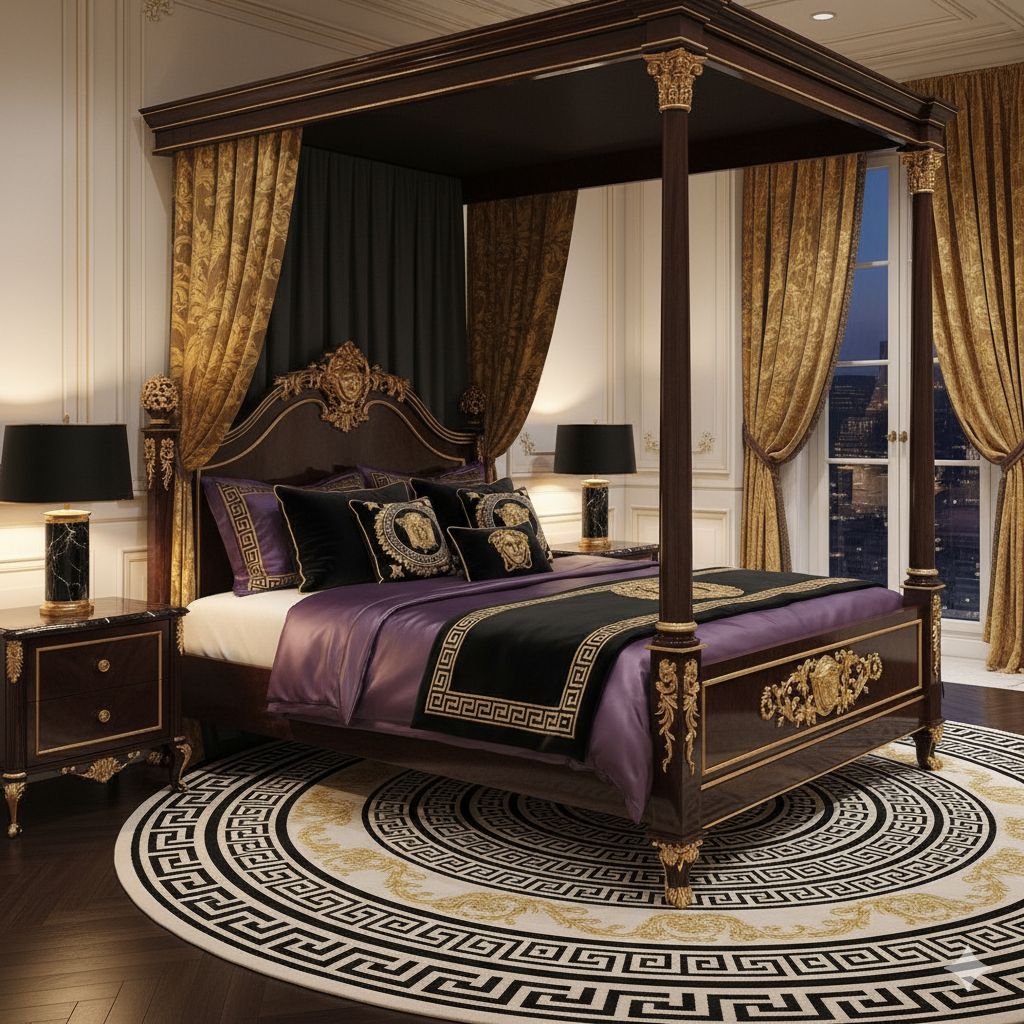 Versace’s bold patterns work beautifully against neutral backgrounds. Pair rich Barocco upholstery with cream walls, taupe carpeting, or soft gray tones that allow the patterns to shine. Alternatively, embrace maximalism by layering multiple Versace patterns in coordinated colorways.
