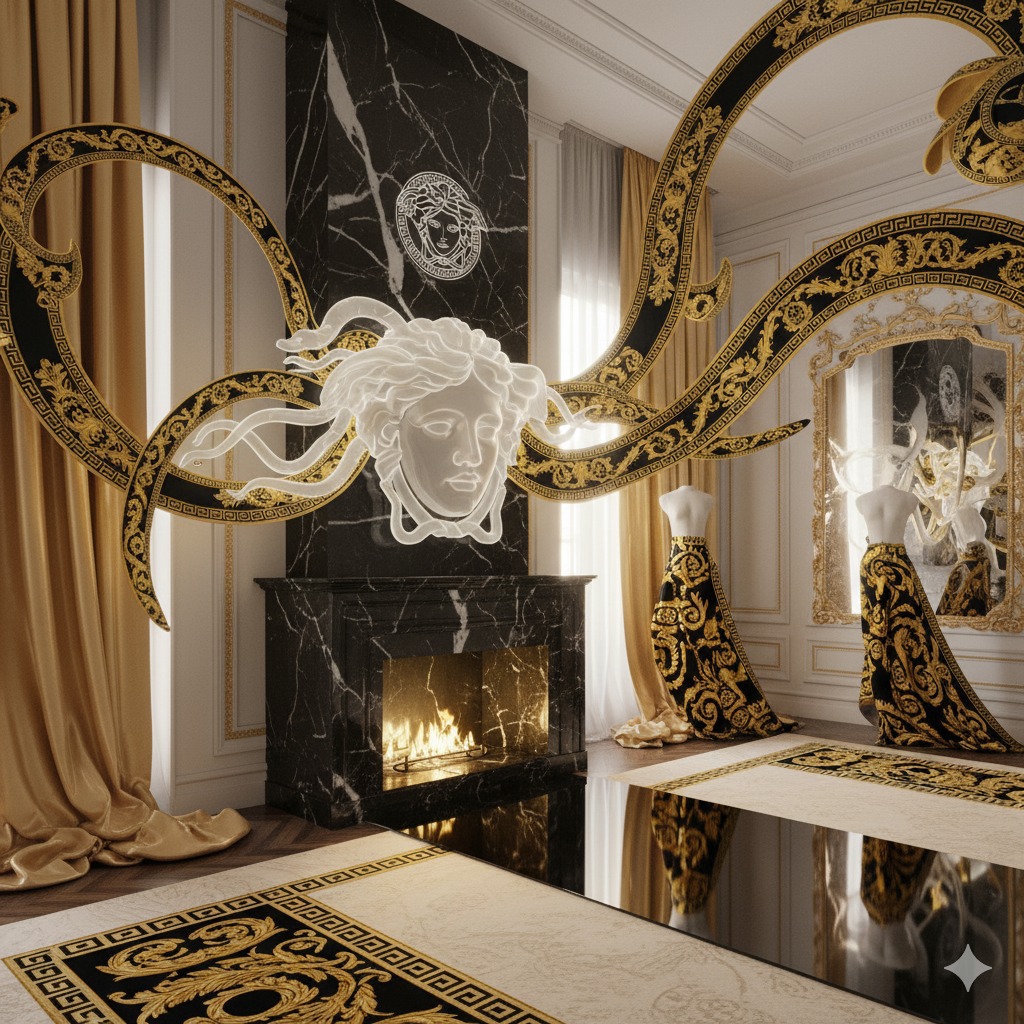 Statement furniture pieces feature three-dimensional Medusa medallions in polished brass, chrome, and even mother-of-pearl inlays. Coffee tables showcase the iconic head as a central artistic element, while bed headboards incorporate oversized Medusa reliefs that create dramatic bedroom focal points. Wall panels and mirrors framed with Medusa borders transform ordinary walls into gallery-worthy installations.
